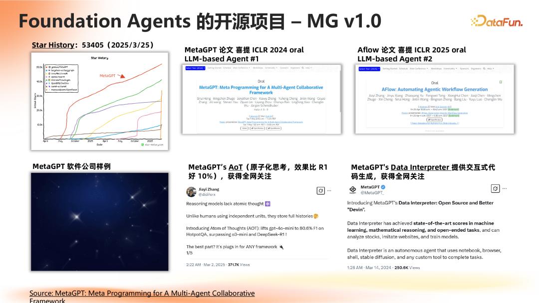 目前 MetaGPT 有 55k 的 star,一个开源项目 Open Miners 有 45k 的 star,一共将近 100k 的 star。这两个项目已经归纳到 Foundation Agent 的组织中。