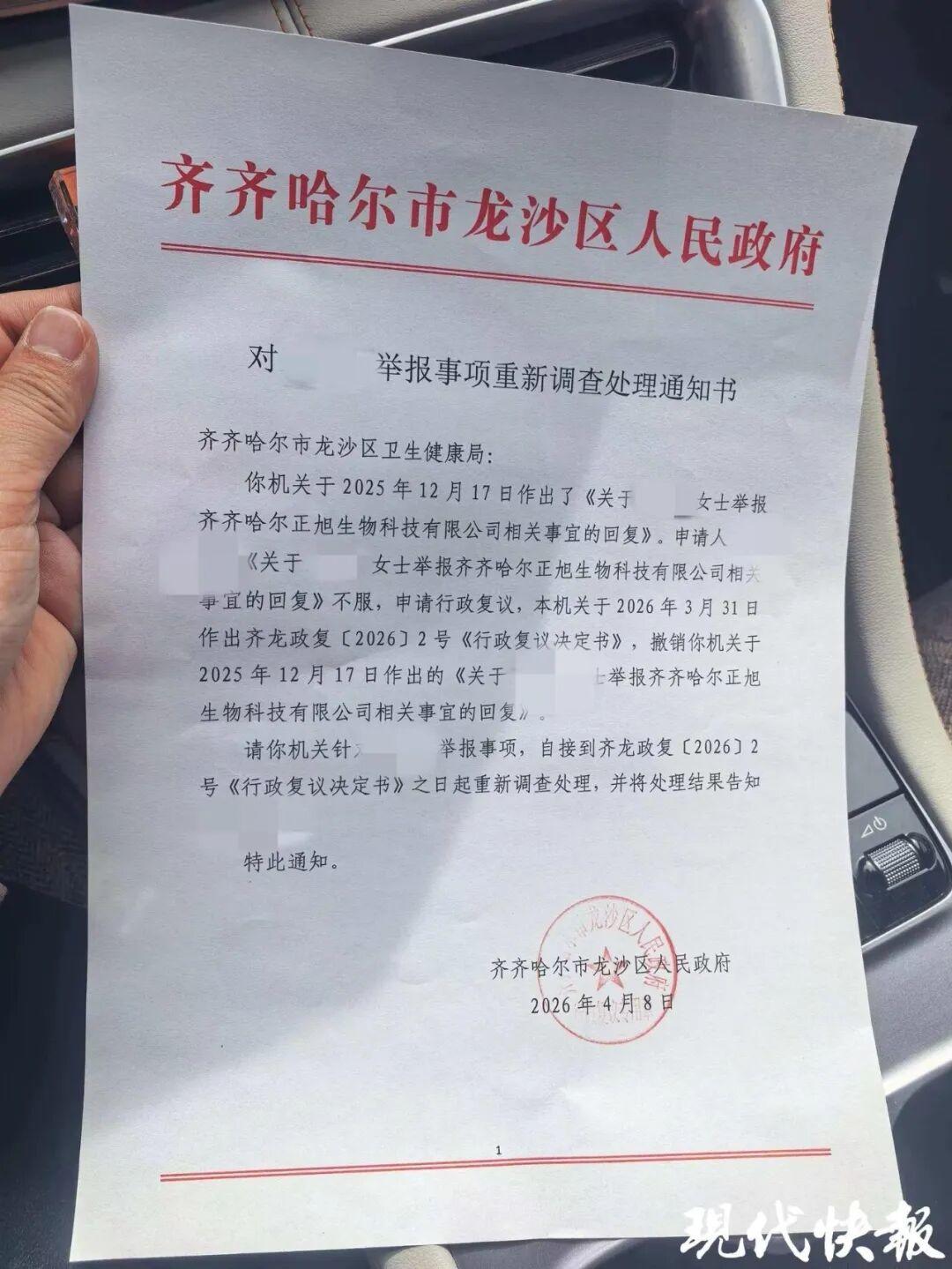 “我如果不是来治病,谁会花2万多元买消毒剂?而且我忙着治病,最后一次付款是2023年9月,并且后面还在治疗,2025年9月就说不受理了。”对于卫健局的回复,吴某不服,提出复议。今年4月8日,齐齐哈尔市龙沙区人民政府发布重新调查处理通知书,撤销了区卫健局于2025年12月17日作出的《关于***女士举报齐齐哈尔正旭生物科技有限公司相关事宜的回复》,要求重新调查处理,并将处理结果告知当事人。