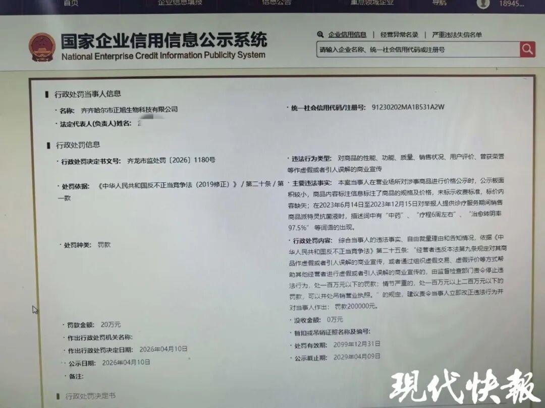 近日,齐齐哈尔市龙沙区市场监督管理局发布行政处罚决定书,齐齐哈尔市正旭生物科技有限公司(以下简称正旭公司)因对商品功能作虚假商业宣传、价格公示不规范,被处以20万元罚款。而吴某反映的核心问题——“无证行医、非法诊疗”,已被移送当地卫健局处理。
