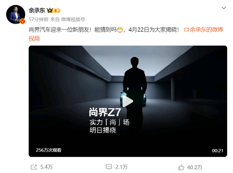 4月21日消息,今日一早,华为常务董事、终端BG董事长余承东在微博发文预热,表示“尚界汽车迎来一位新朋友”,并让大家猜一猜是谁。而据此前消息,尚界汽车代言人有望为演员肖战。