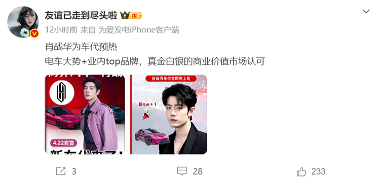 实际上,在稍微早些时候就已经传出相关信息,表示肖战将会代言尚界汽车。有博主也在近日发布了一张海报,画面包含“尚界Z7×肖战 肖战汽车代言即将上线”字样,并配有肖战和尚界Z7车型图片。该博主称相关TVC已完成拍摄,但4月22日的发布会肖战不会到场,截至目前,尚界品牌与肖战方面尚未就代言信息作出官方确认。