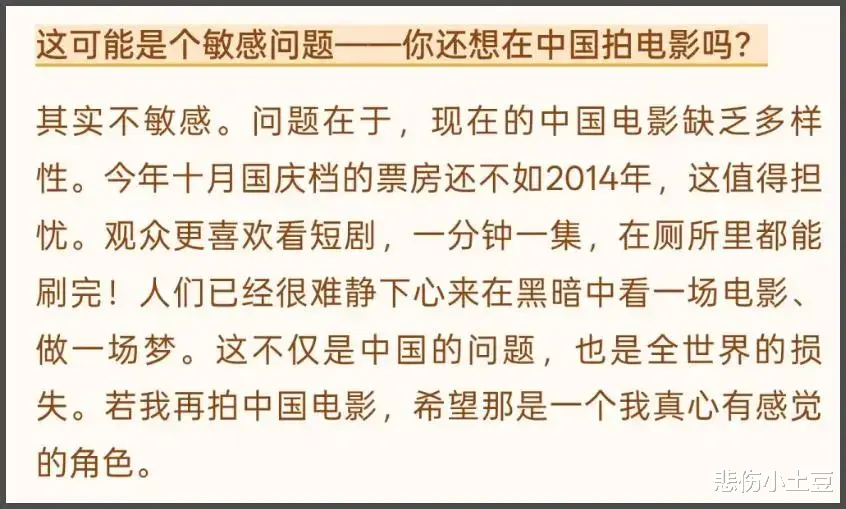 紧接着范冰冰又说,如果自己再拍中国电影,希望是一个她真心有感觉的角色。
