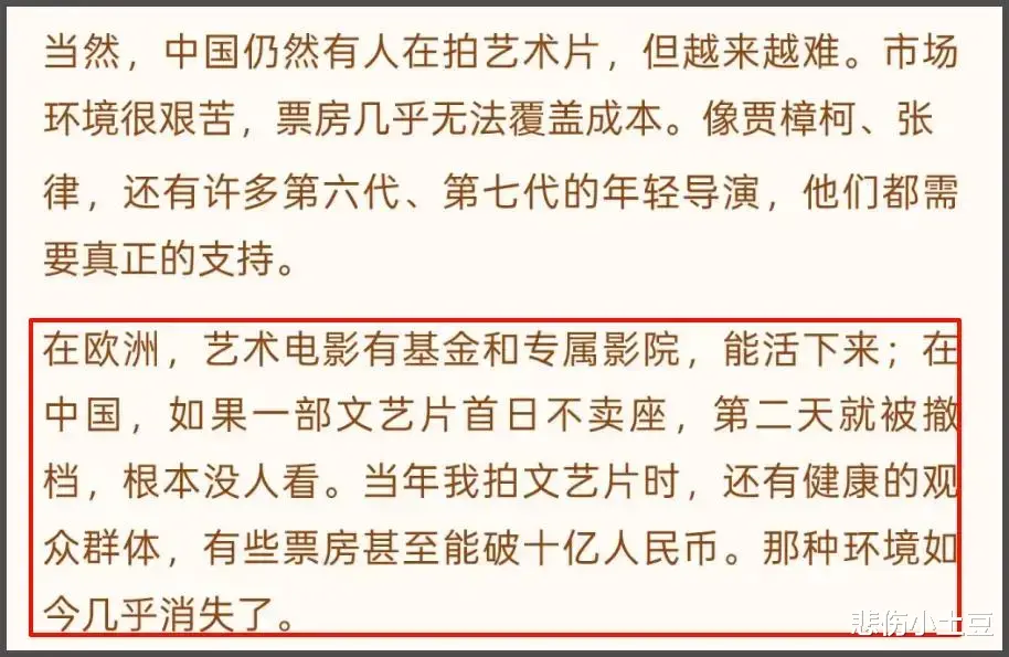 范冰冰又拿国内外艺术片做比较。说中国电影艺术片市场环境越来越难,夸赞欧洲艺术电影有基金和专属影院,但国内的文艺片没有这种待遇,而且如果首日不卖座,之后面临的就是撤档。话里话外都是在说国内电影对文艺片的支持度不够,还说自己当年拍文艺片的时候,还有健康的观众群体,票房甚至都能破十亿。