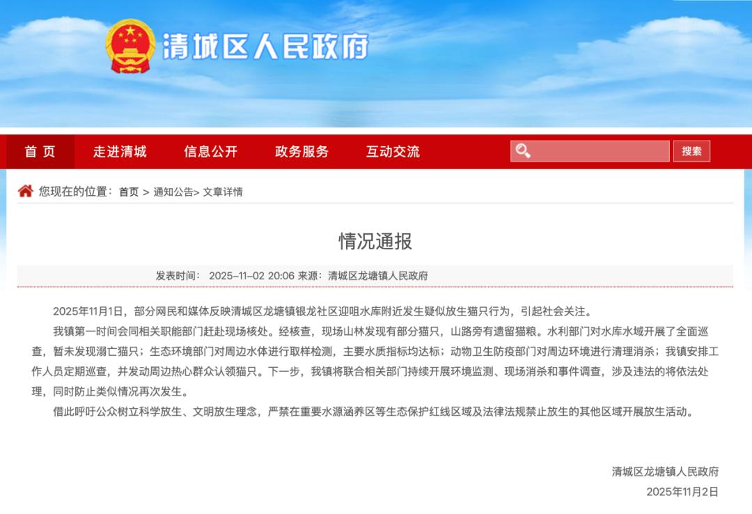 11月1日,部分网民和媒体反映清城区龙塘镇银龙社区迎咀水库附近发生疑似放生猫只行为,引起社会关注。
