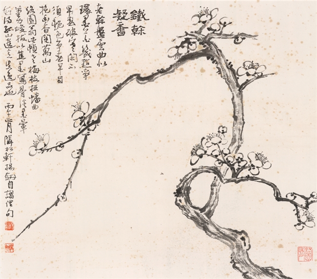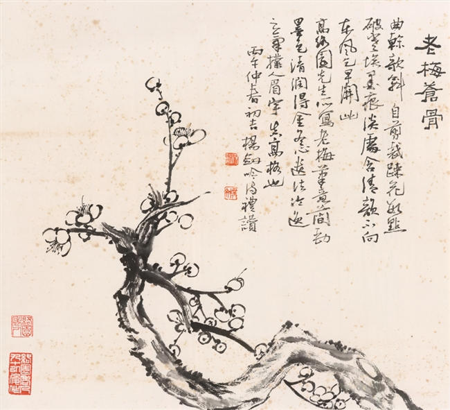 跋:络园翁此帧老梅枝桠蟠曲,笔力峻拔。以焦墨写骨,淡墨晕花,得孤山遗意,真逸品也。丙午正月邻松轩杨剑自诌俚句。