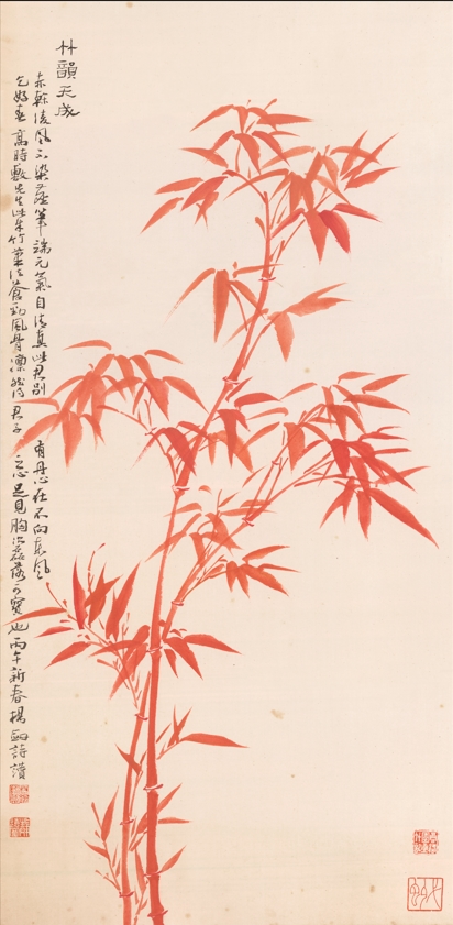 跋:高时敷先生此朱竹,笔法苍劲,风骨凛然,得君子之心,足见胸次磊落,可宝也。丙午新春杨剑诗赞。