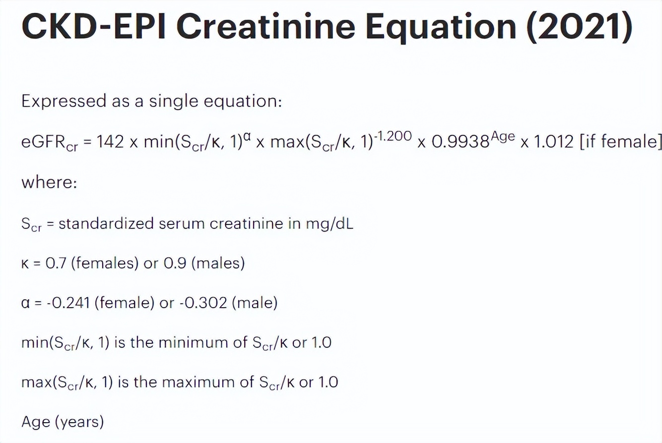 首先,可以告诉大家,最推荐的首选公式,是CKD-EPI肌酐2021版新公式,也就是CKD-EPI2021版公式中单独使用血肌酐估算肾小球滤过率。(注:有一些医院用别的公式算,所以会有差异)