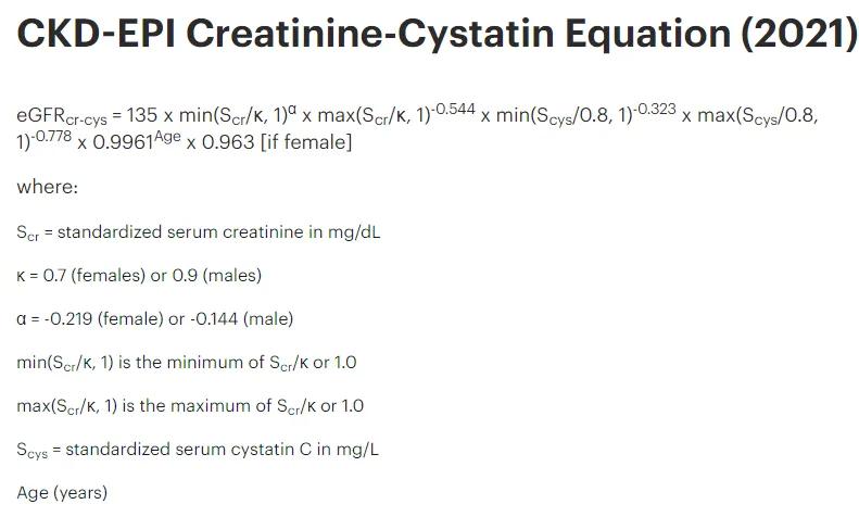 最准确:基于肌酐+胱抑素C计算目前,大部分研究都认为,肌酐和胱抑素C联合公式是最准确的,即CKD-EPI肌酐-胱抑素C2021版公式。
