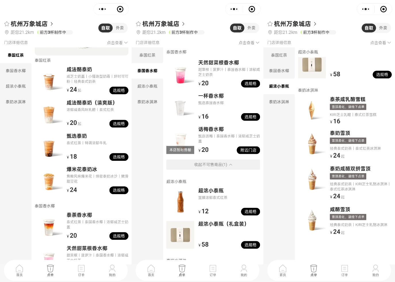 从品牌基础信息看,泰柯成立于2025年4月,首店位于苏州十全街,以泰式茶饮为核心产品线,目前共有13款单品,其中包括4款冰淇淋。产品定价在12元至24元之间,大部分仅设“少糖”和“标准糖”两种甜度选项,所有茶饮均采用统一茶底,风格鲜明简洁。