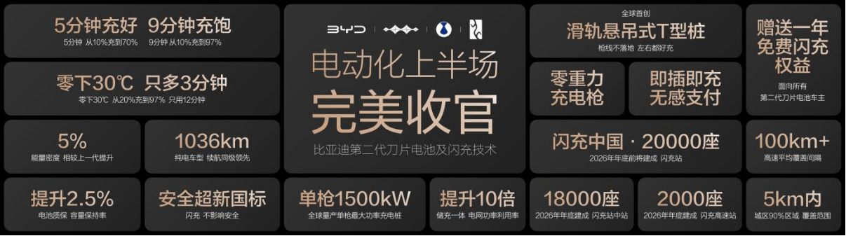 福利方面,搭载第二代刀片电池的车主可享1年免费闪充,后续收费与行业持平。此次技术突破,不仅收官电动化上半场,更彰显比亚迪技术实力。