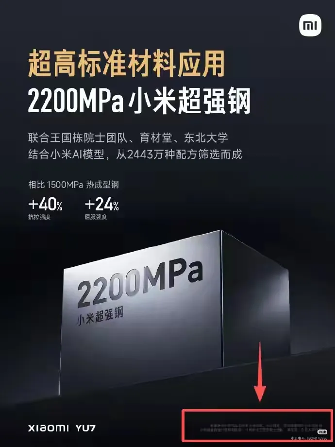 更引发热议的是,“2200MPa某米超强钢”的高光数据下,小字备注却显示“某米超强钢指材质项目名称”,在安全问题上耍小聪明,让消费者大跌眼镜,质疑是否名不副实。