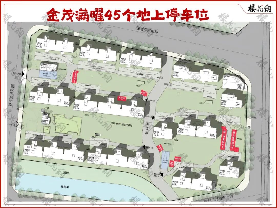 以街坊路为界,金茂满曜的地上停车位,东区32个,西区13个。