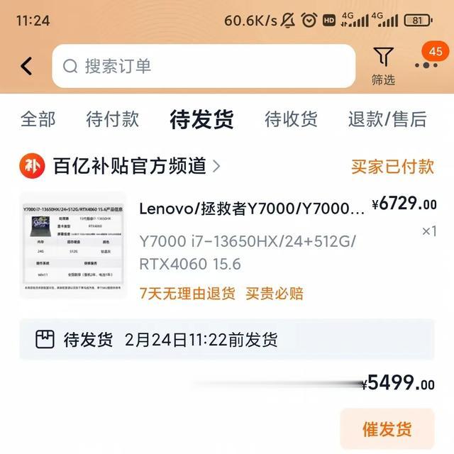 用途和预算:我买电脑的主要作用就是学做设计或者视频剪辑,偶尔玩一玩游戏啥的,6000左右预算,也在网上看了很多攻略,做了很多对比,最终选择了联想拯救者y7000或者Y7000p版本,也看了很多对比价格,感觉淘宝的百亿补贴y7000最便宜5499元这么太爽了,居然还有人买成功了!