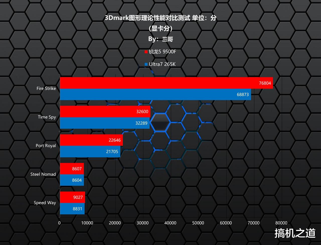 在3DMARK系列图形理论测试中,锐龙5 9500F在所有项目中均领先于Ultra7 265K,其中在3DMARK Fire Strike测试中更是有着高达11.52%的领先幅度。