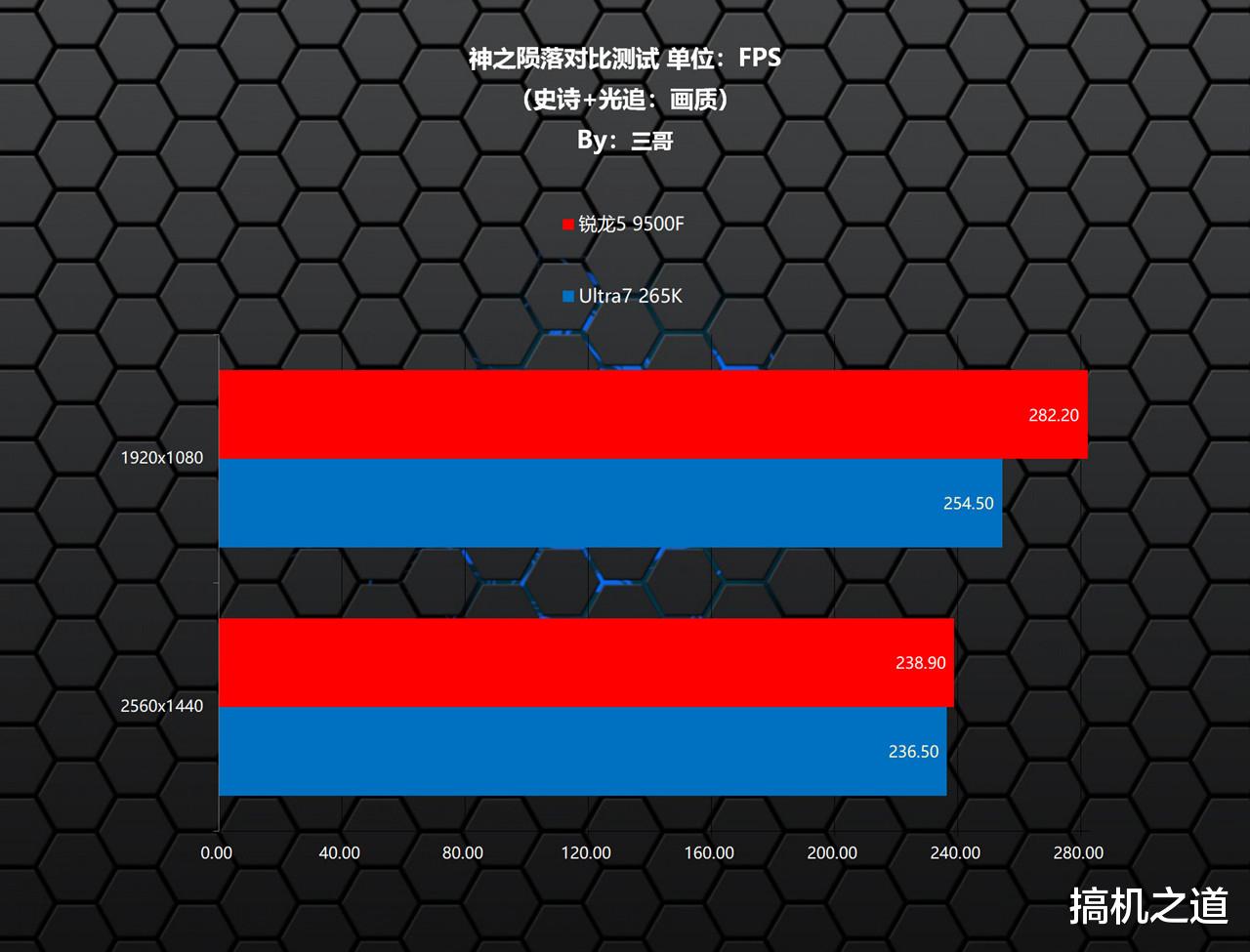 在《神之陨落》测试中,锐龙5 9500F相较Ultra7 265K,在两个分辨率下有不同程度的领先,其中1080P分辨率下领先了27.70帧,领先比率10.88%;1440P分辨率下领先了2.40帧,领先比率1.01%。
