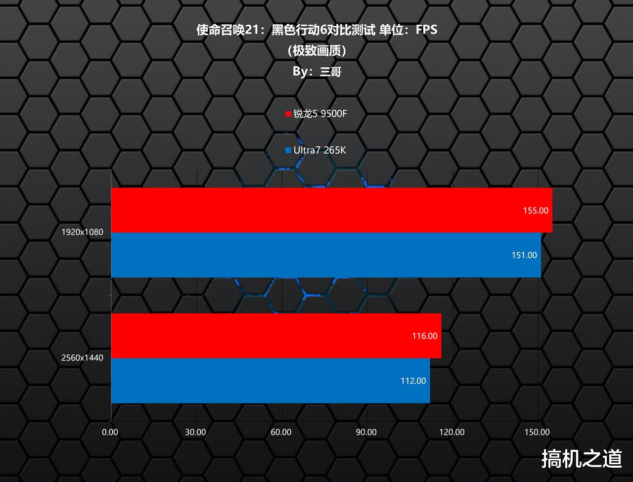 在《使命召唤21:黑色行动6》测试中,锐龙5 9500F相较Ultra7 265K,在两个分辨率下均有小幅度的领先,其中1080P分辨率下领先了4.00帧,领先比率2.65%;1440P分辨率下领先了4.00帧,领先比率3.57%。