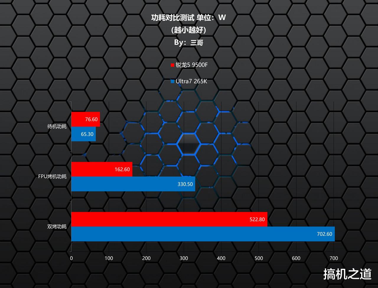 功耗对比测试,可以看出锐龙5 9500F的烤机功耗和双烤功耗也远低于Ultra7 265K。