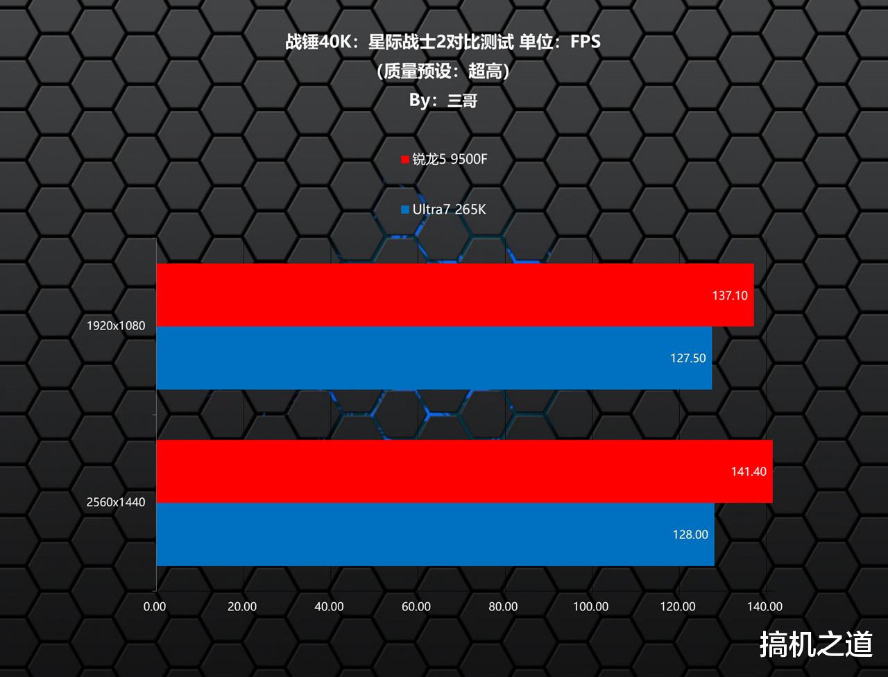 在《战锤40K:星际战士2》测试中,锐龙5 9500F相较Ultra7 265K,在两个分辨率下均有较为明显的领先,其中1080P分辨率下领先了9.60帧,领先比率7.53%;1440P分辨率下领先了13.40帧,领先比率10.47%。