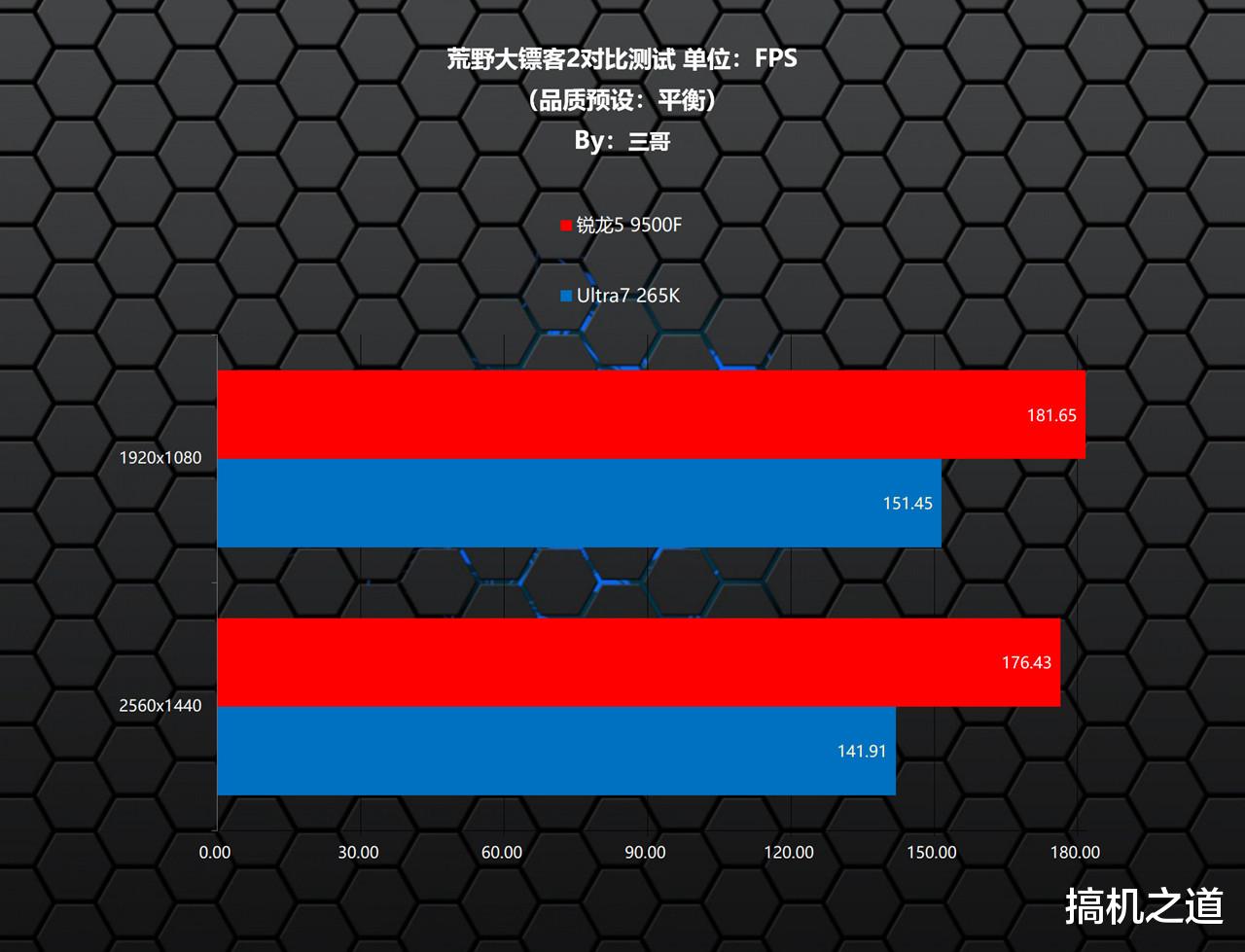 在《荒野大镖客2》测试中,锐龙5 9500F相较Ultra7 265K,在两个分辨率下均有大幅度的领先,其中1080P分辨率下领先了30.20帧,领先比率19.94%;1440P分辨率下领先了34.52帧,领先比率24.33%。