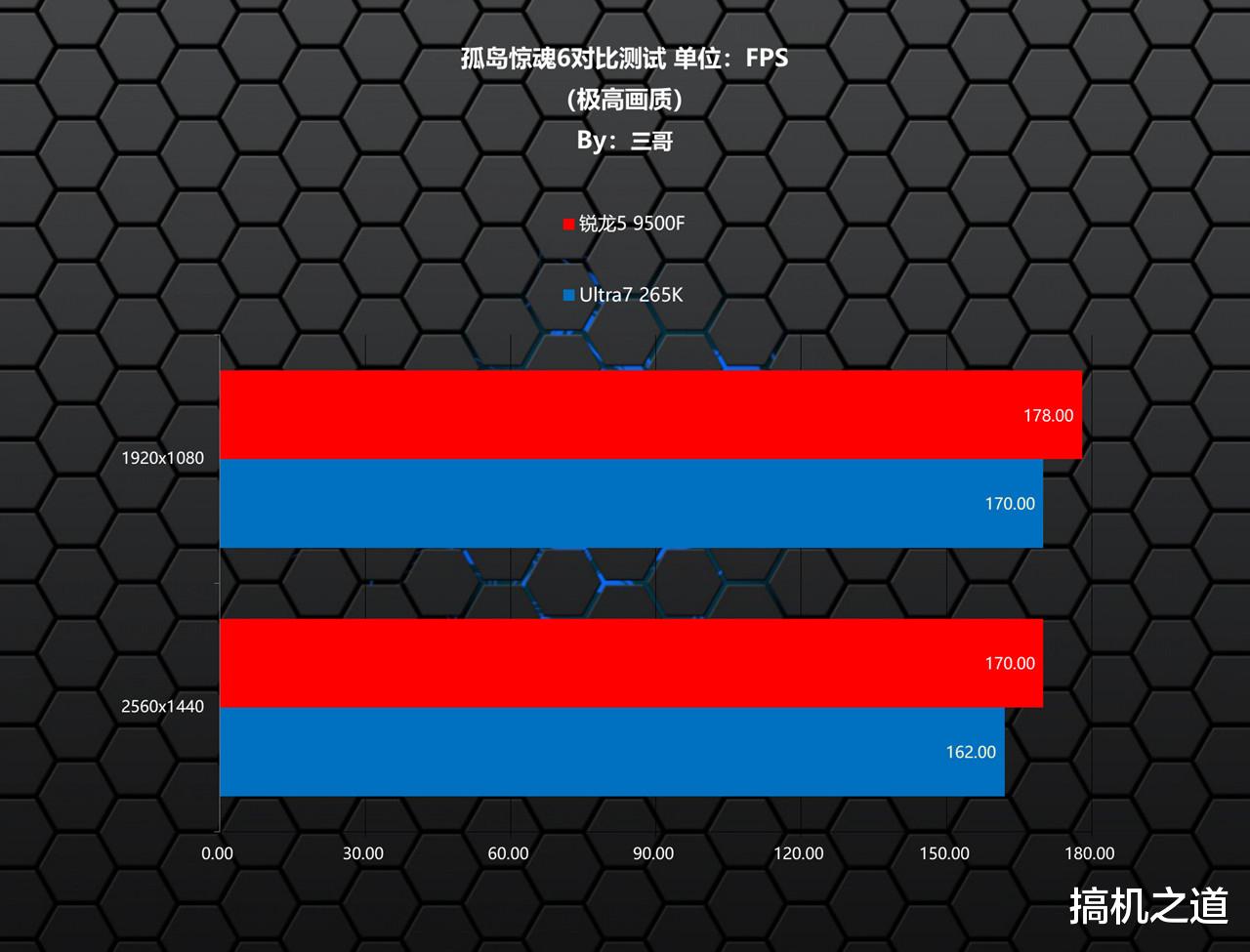 在《孤岛惊魂6》测试中,锐龙5 9500F相较Ultra7 265K,在两个分辨率下均有较为明显的领先,其中1080P分辨率下领先了8.00帧,领先比率4.71%;1440P分辨率下领先了8.00帧,领先比率4.94%。