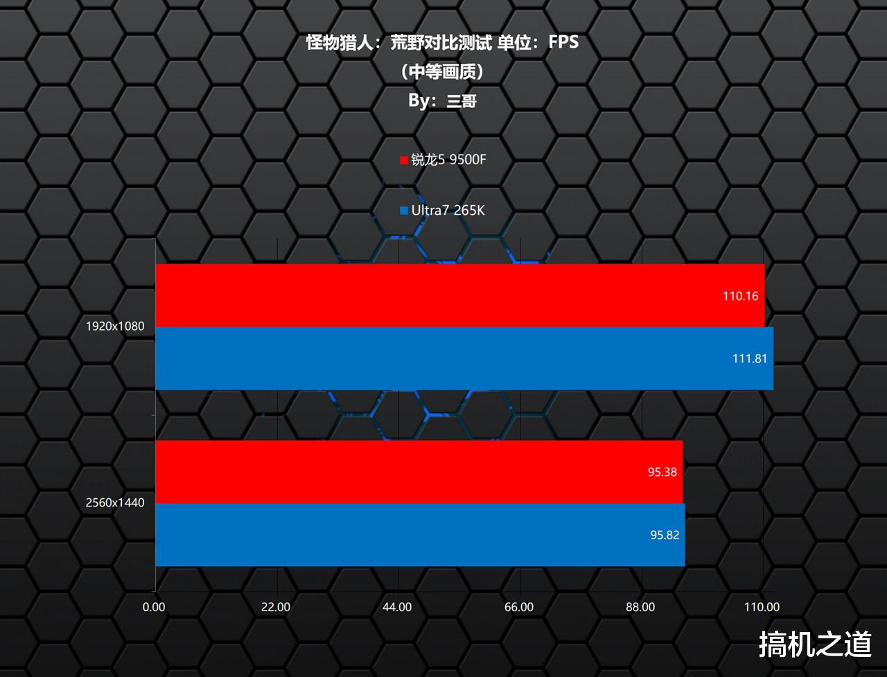在《怪物猎人:荒野》测试中,锐龙5 9500F相较Ultra7 265K,在两个分辨率下均有较为微弱的落后,其中1080P分辨率下落后了1.65帧,落后比率1.48%;1440P分辨率下落后了0.44帧,落后比率0.46%。