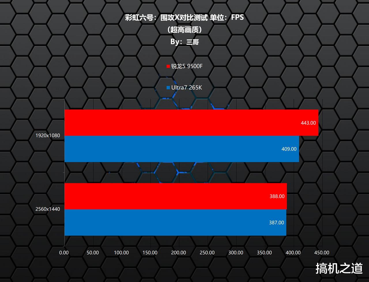 在《彩虹六号:围攻X》测试中,锐龙5 9500F相较Ultra7 265K,在两个分辨率下有不同程度的领先,其中1080P分辨率下领先了34.00帧,领先比率8.31%;1440P分辨率下领先了1.00帧,领先比率0.26%。