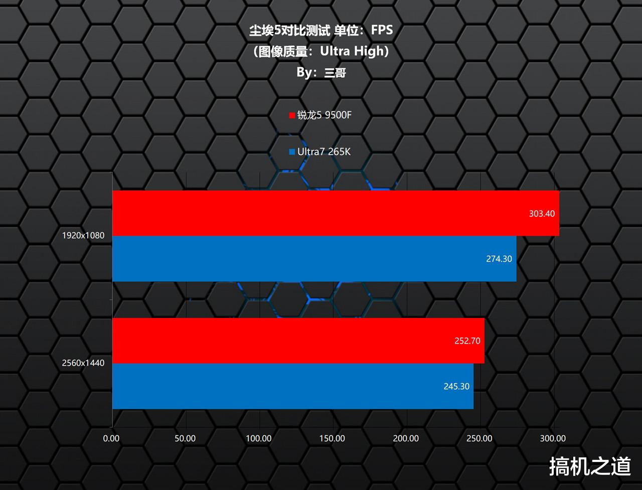 在《尘埃5》测试中,锐龙5 9500F相较Ultra7 265K,在两个分辨率下有不同程度的领先,其中1080P分辨率下领先了29.10帧,领先比率10.61%;1440P分辨率下领先了7.40帧,领先比率3.02%。