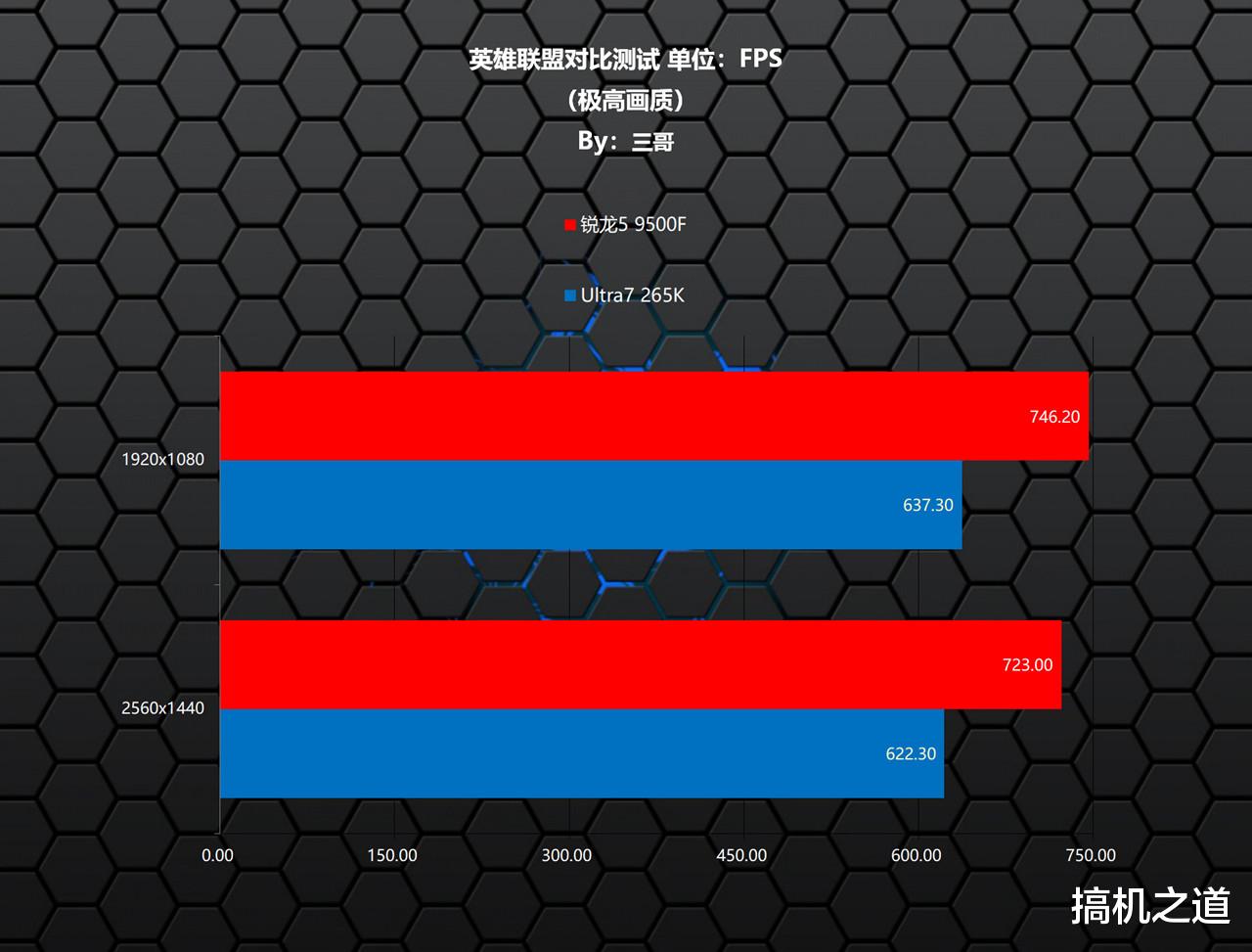 在《英雄联盟》测试中,锐龙5 9500F相较Ultra7 265K,在两个分辨率下均有大幅度的领先,其中1080P分辨率下领先了108.90帧,领先比率17.09%;1440P分辨率下领先了100.70帧,领先比率16.18%。