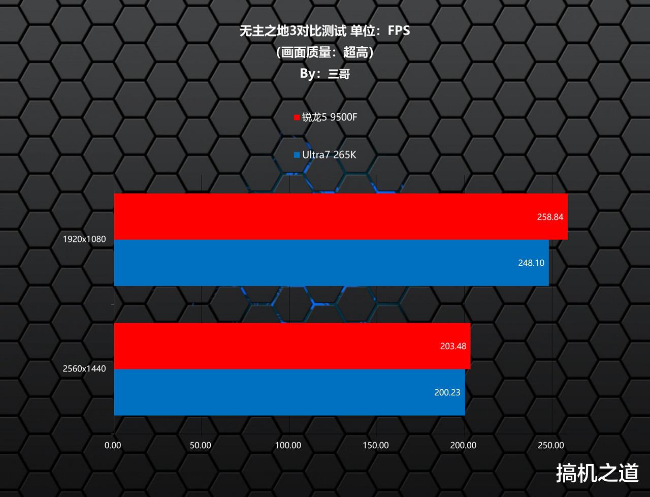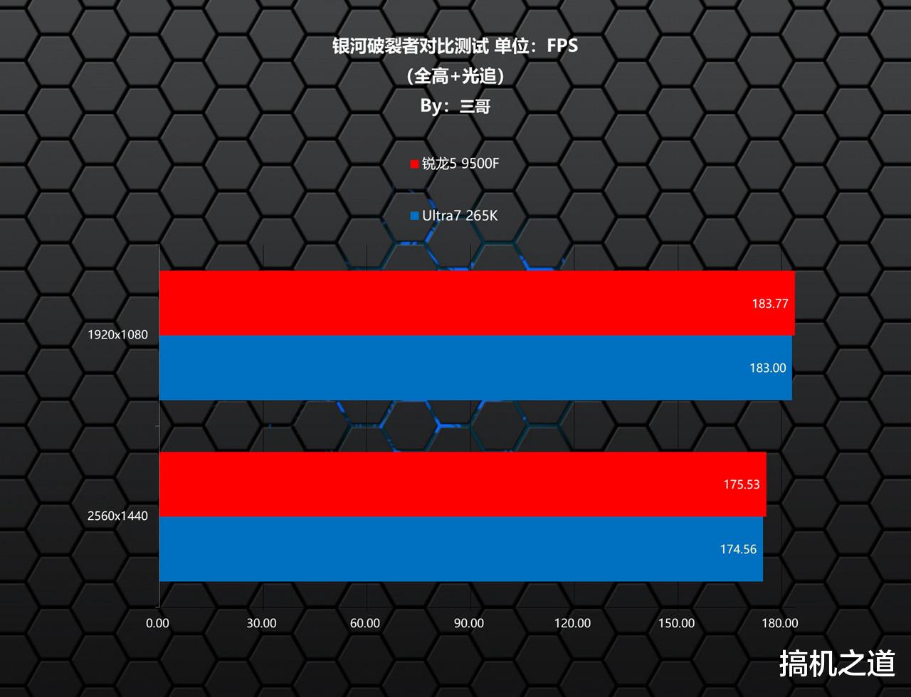 在《银河破裂者》测试中,锐龙5 9500F相较Ultra7 265K,在两个分辨率下均有较为微弱的领先,其中1080P分辨率下领先了0.77帧,领先比率0.42%;1440P分辨率下领先了0.97帧,领先比率0.56%。