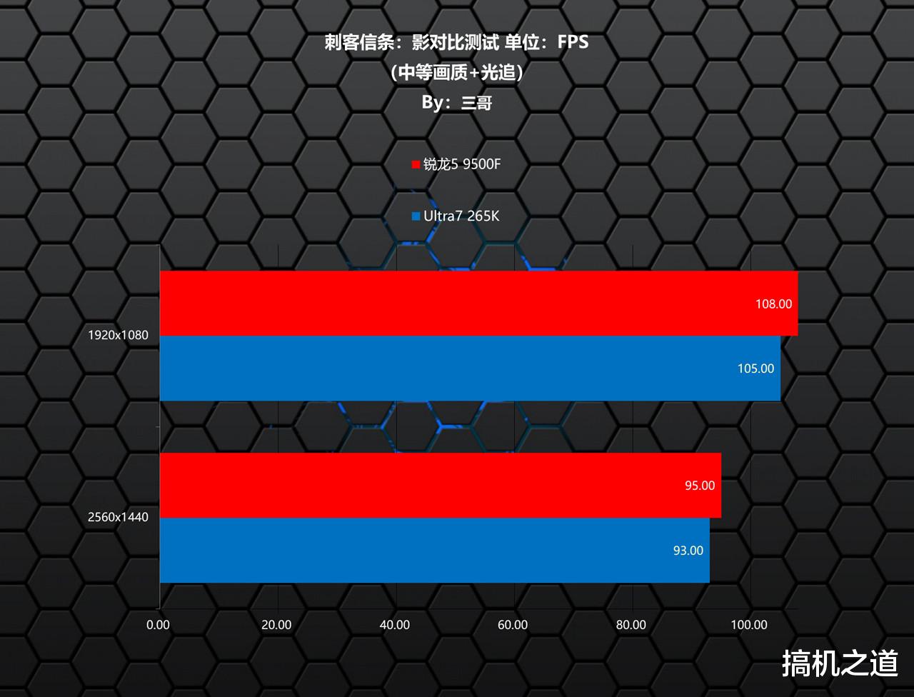 在《刺客信条:影》测试中,锐龙5 9500F相较Ultra7 265K,在两个分辨率下均有小幅度的领先,其中1080P分辨率下领先了3.00帧,领先比率2.86%;1440P分辨率下领先了2.00帧,领先比率2.15%。