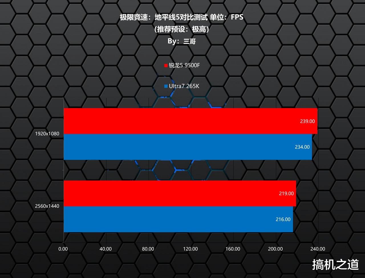 在《极限竞速:地平线5》测试中,锐龙5 9500F相较Ultra7 265K,在两个分辨率下均有小幅度的领先,其中1080P分辨率下领先了5.00帧,领先比率2.14%;1440P分辨率下领先了3.00帧,领先比率1.39%。