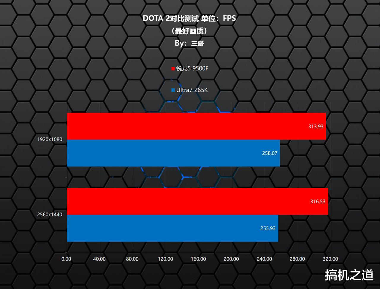 在《DOTA 2》测试中,锐龙5 9500F相较Ultra7 265K,在两个分辨率下均有大幅度的领先,其中1080P分辨率下领先了55.86帧,领先比率21.65%;1440P分辨率下领先了60.60帧,领先比率23.68%。