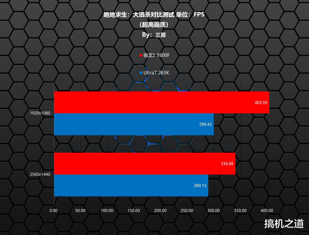 在《绝地求生:大逃杀》测试中,锐龙5 9500F相较Ultra7 265K,在两个分辨率下均有大幅度的领先,其中1080P分辨率下领先了104.16帧,领先比率34.79%;1440P分辨率下领先了50.75帧,领先比率17.55%。