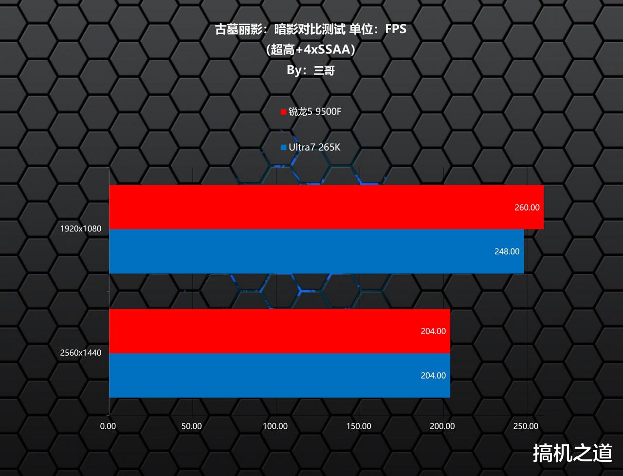 在《古墓丽影:暗影》测试中,锐龙5 9500F相较Ultra7 265K,在两个分辨率下有不同程度的领先,其中1080P分辨率下领先了12.00帧,领先比率4.84%;1440P分辨率下二者持平。