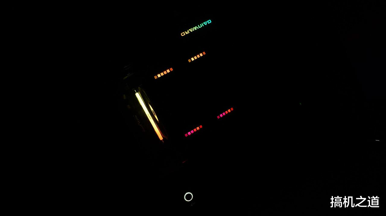 显卡灯效特写,由于机箱采用了倒置结构,所以显卡的LOGO也是倒着的。