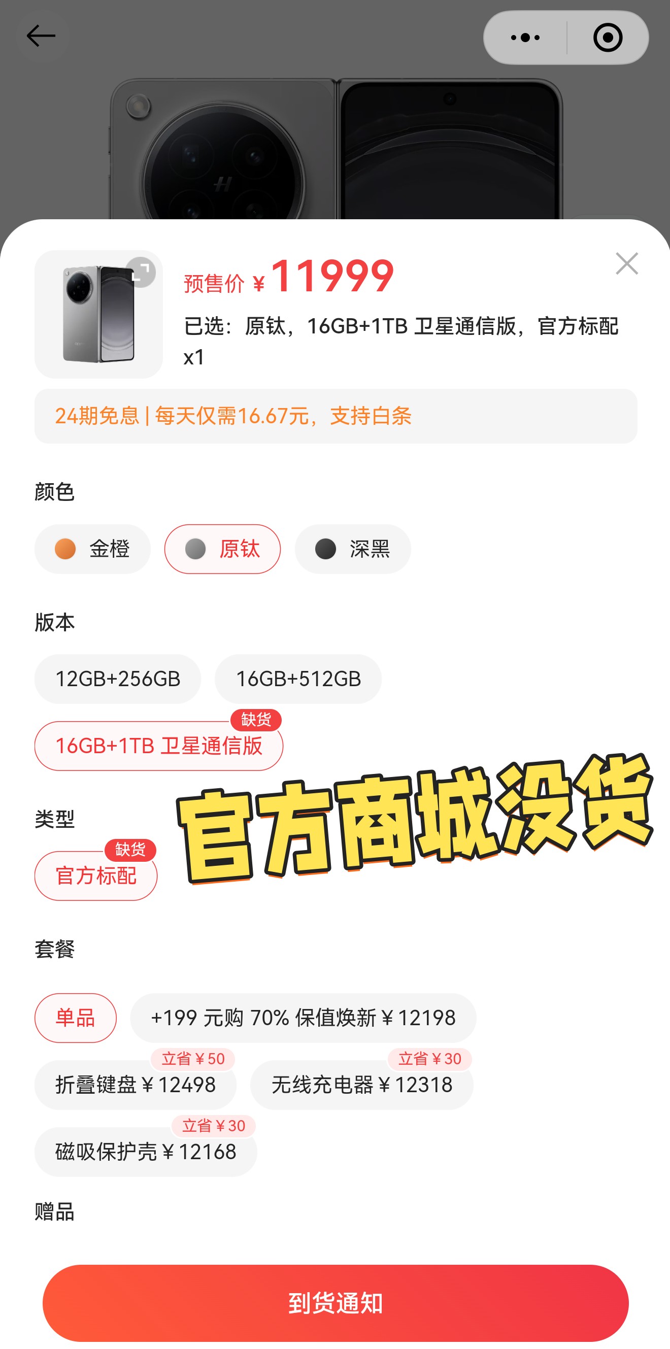然后比较尴尬的就来了,我之前在店里问了销售说我想买1TB的,有没有现货,她跟我说钛色和橙色都卖断货了,想要的话可以考虑下黑色款~然后我就想着说到线上平台看看,结果官方商城和某东看了居然1TB的钛色同样缺货,橙色的也要等到25号之后才有现货,今年的OPPO折叠机这么火的嘛