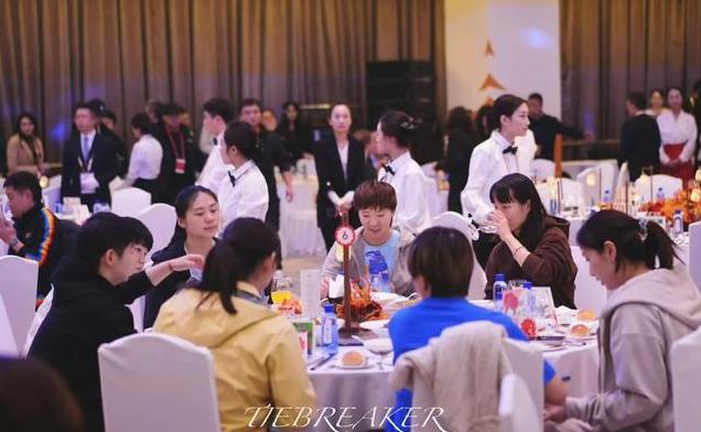 期间不断地有工作人员来回穿插在宴会厅上服务在场的运动员。