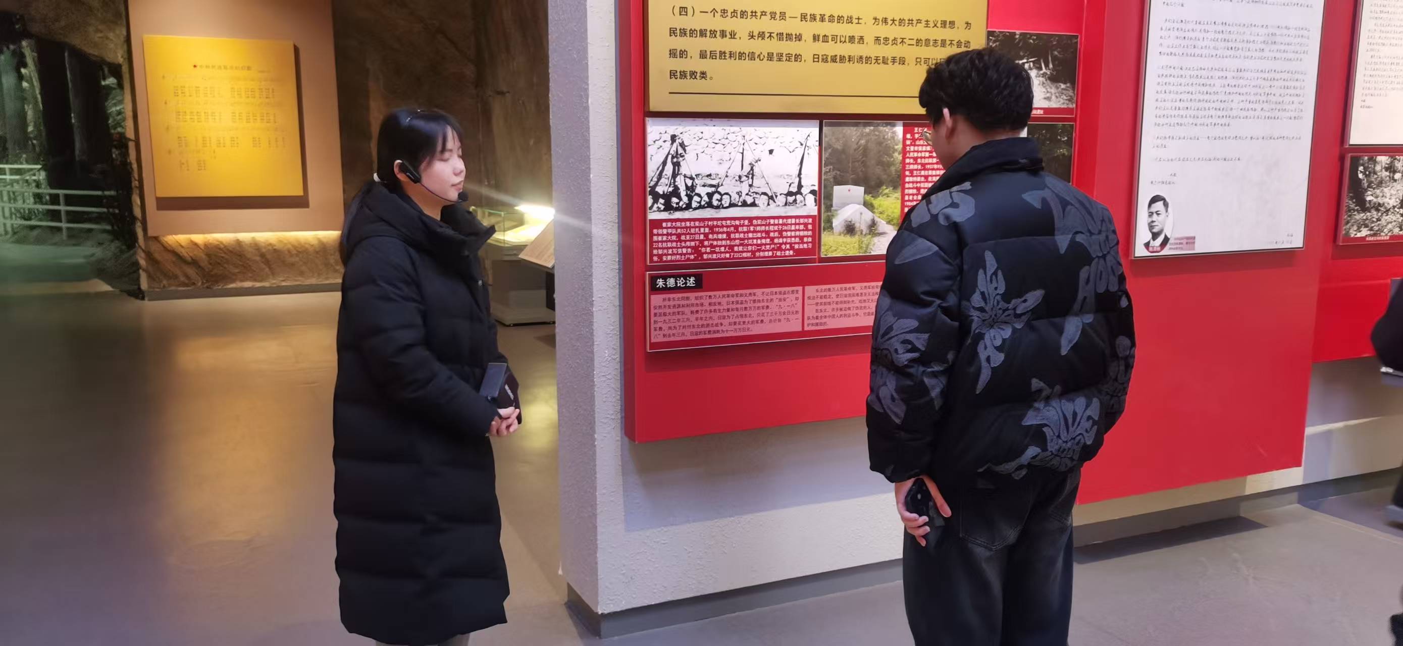 跟随讲解员王女士的步伐,队伍在一幅巨大的半景画前驻足。画中描绘了将军牺牲前在冰天雪地中与敌周旋的最后时光。谢思垚凝视画面,结合自身对红色教育的思考,向王女士提出了一系列问题:“在那样极端的环境里,是什么支撑着他?”“英雄精神如何从历史照进现实,指引我们当下的选择?”王女士依托详实的史料,以清晰而富有层次的讲解,娓娓道来:“是信仰,是对这片土地和人民最深重的爱。英雄精神从未远离,它关乎每个人在关键时刻的信念选择,在平凡岗位上的责任坚守。”这番解答,也引出了张明辉和志愿者们的思考。作为法律工作者,张明辉格外关注秩序与正义:“将军用生命捍卫的,正是今天我们通过法律去守护的——国家的尊严、社会的安宁、人民的幸福。虽然时代不同、方式不同,但内核一致:都是为了守护。”谢思垚若有所悟,在随身携带的笔记本上认真记录。同行的志愿者也纷纷陷入沉思,有人低声交流着如何在日常志愿服务中践行这种“守护”的职责。对他们来说,这趟参观与其说是学习历史,不如说是在与历史对话,为“新时代我们该如何作为”这一现实命题寻找精神根源。