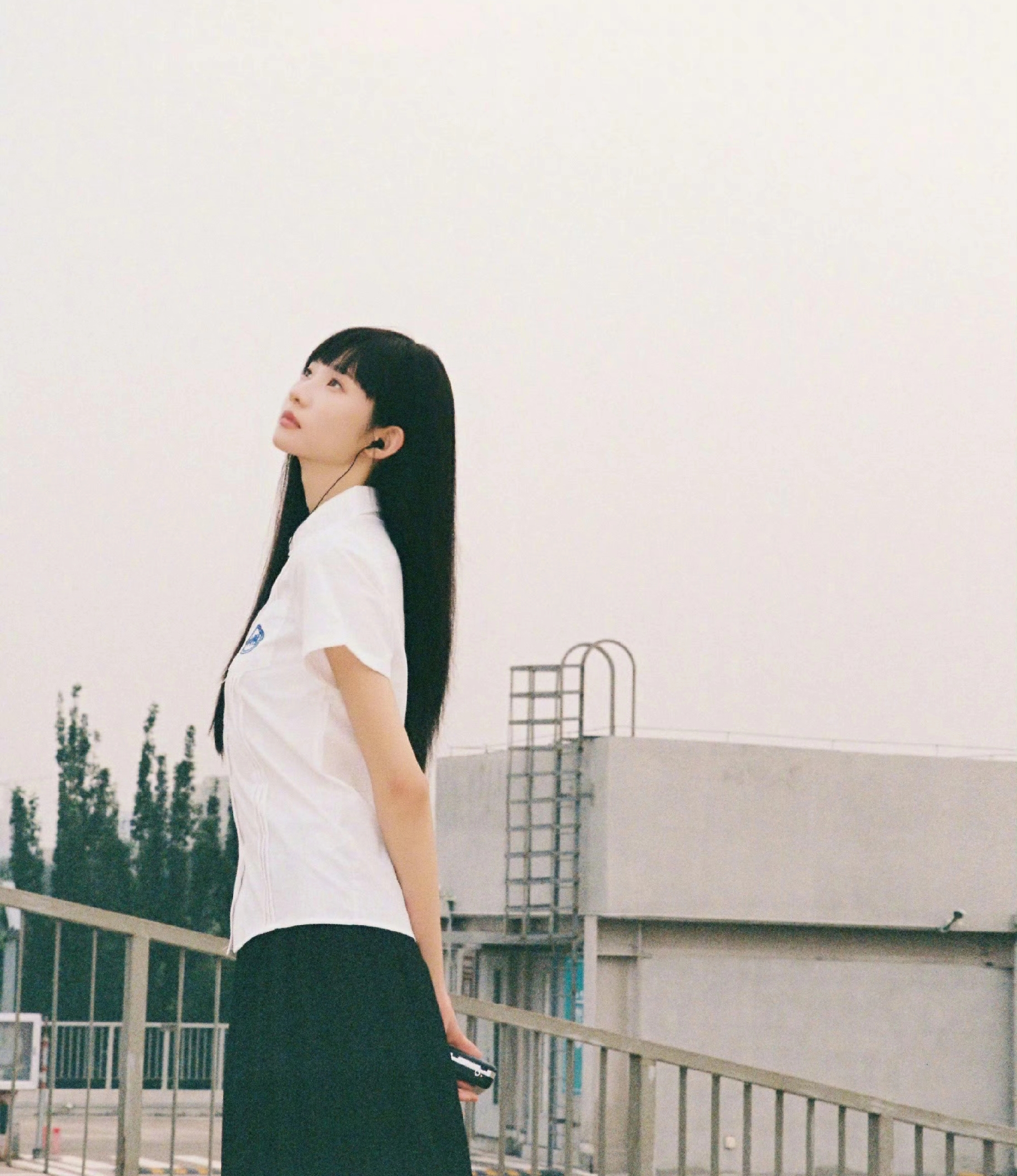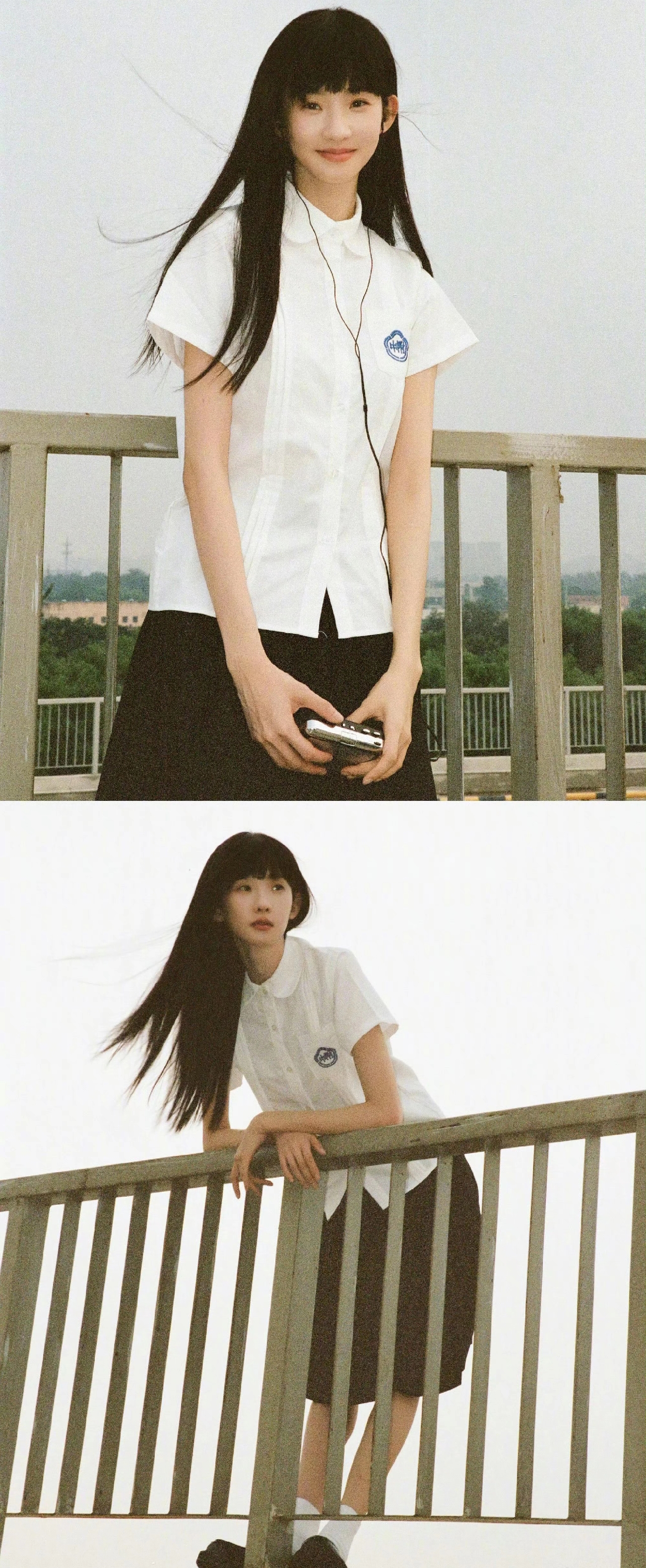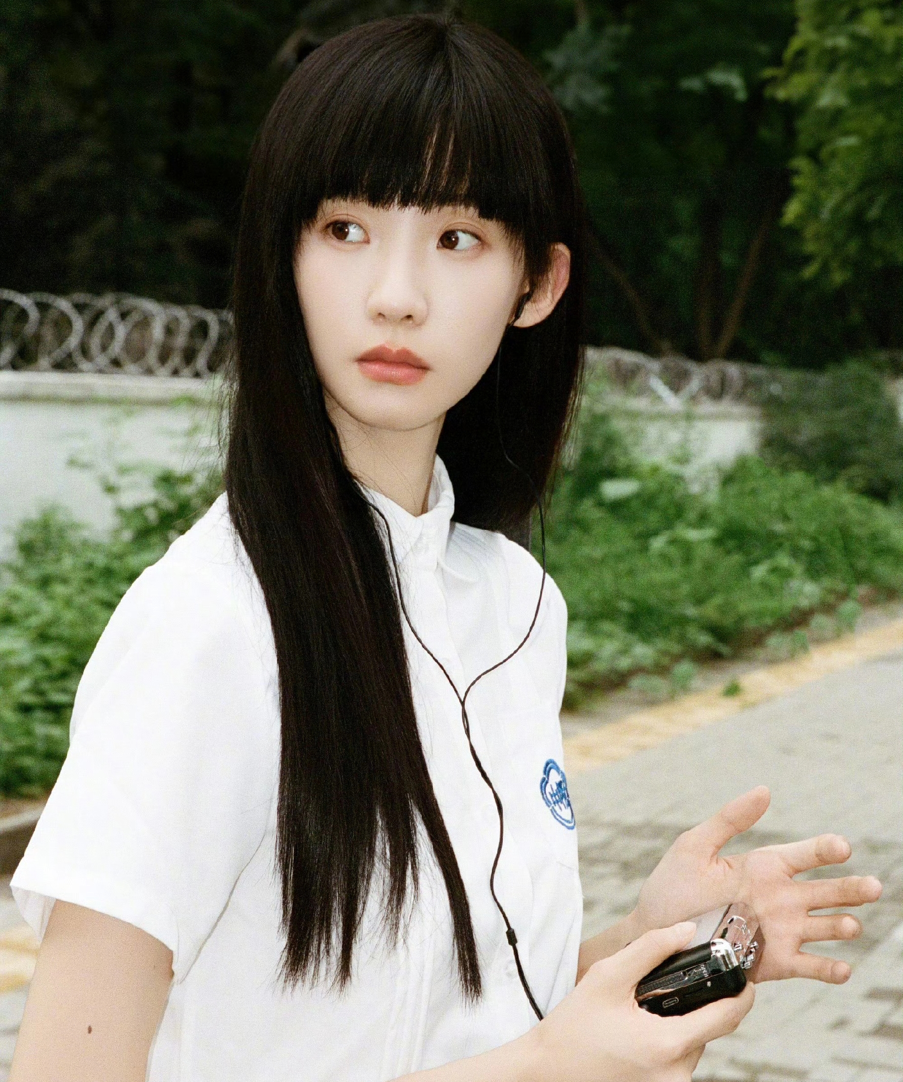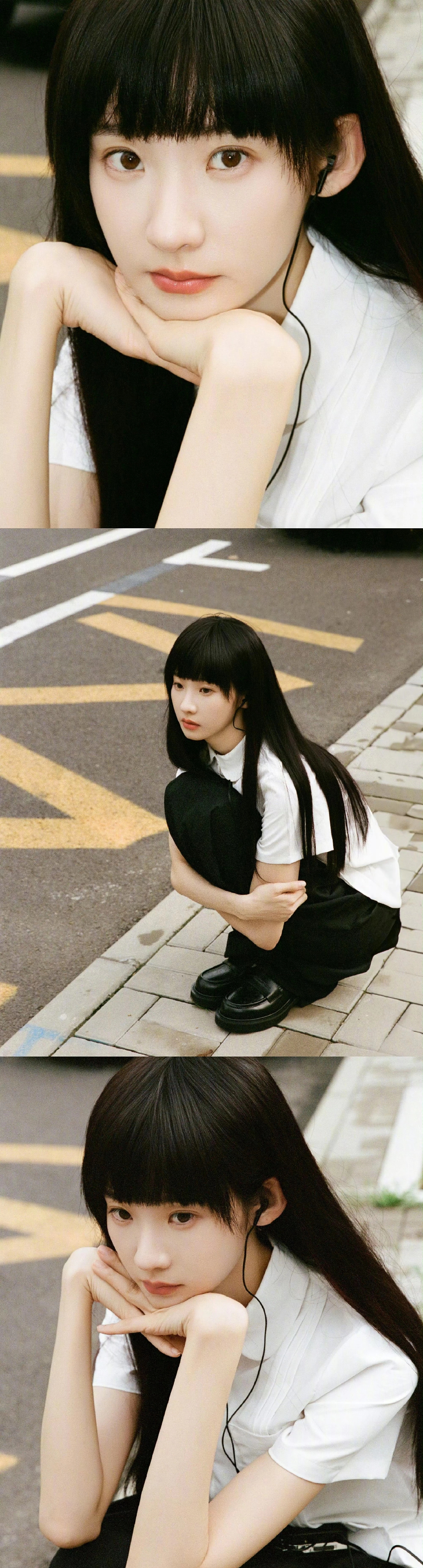 乌黑顺直的长发,齐刘海增添了几分纯澈。时而托腮静望,时而双手抱膝蹲坐路边,眼神清澈中透着些许疏离感,将校园里的青涩与细腻情绪展现得淋漓尽致。