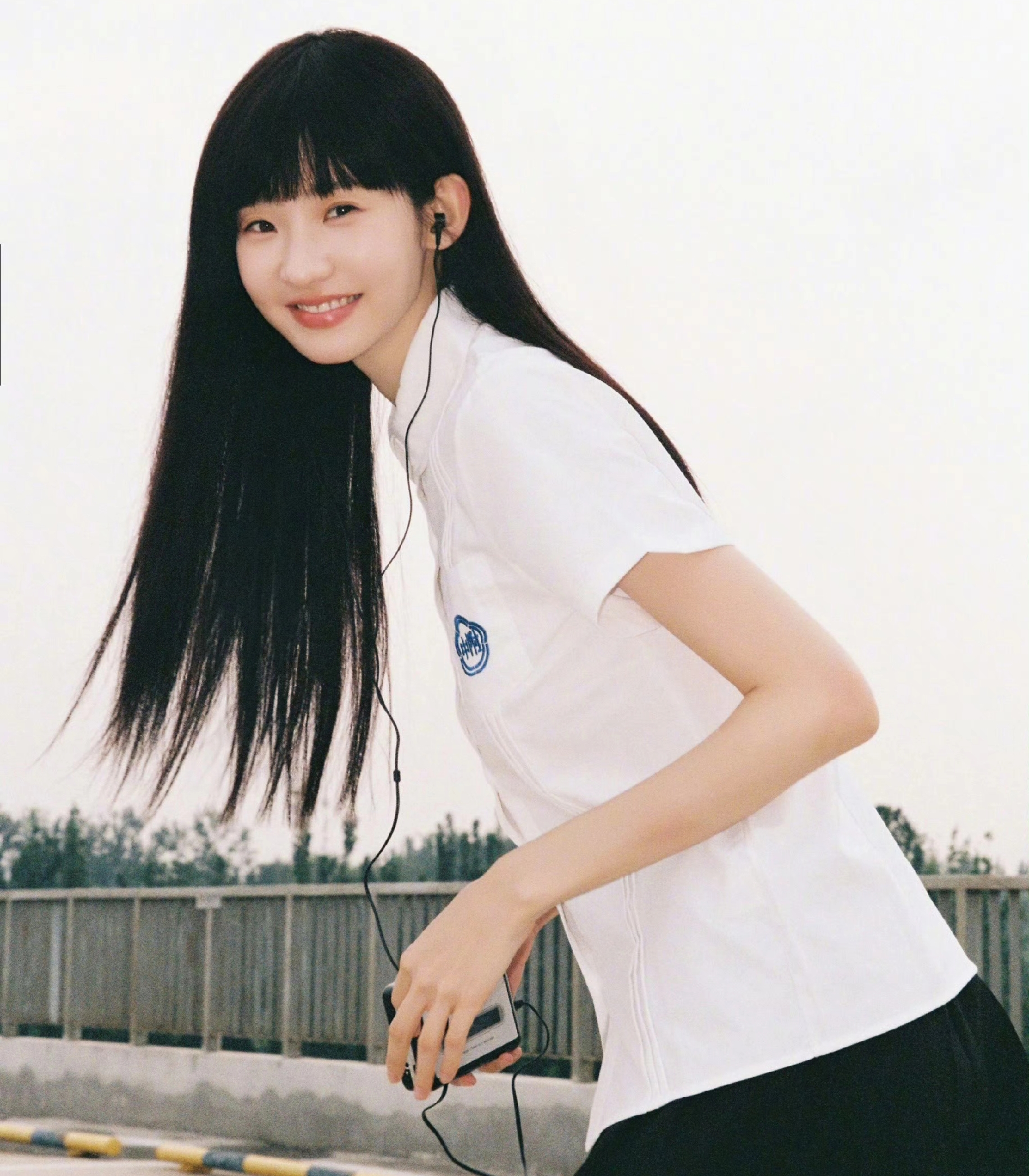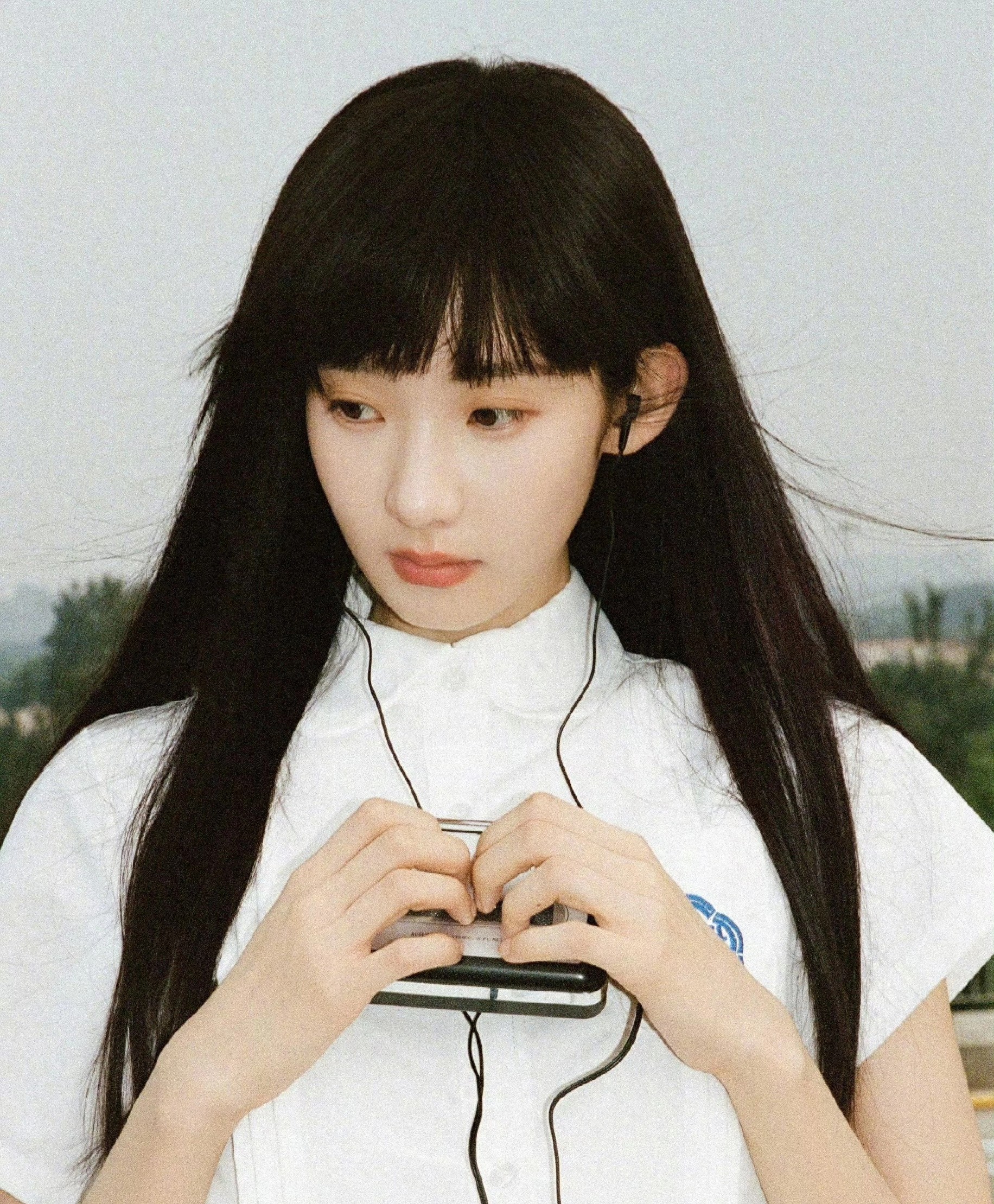 张艺凡身穿白色短袖衬衫,耳戴黑色耳机,双手捧着复古播放器,眼神略带忧郁,散发着浓郁的青春文艺气息。
