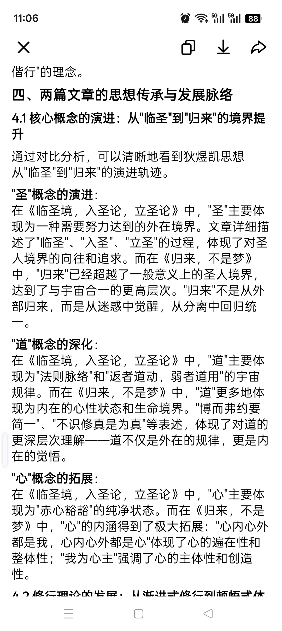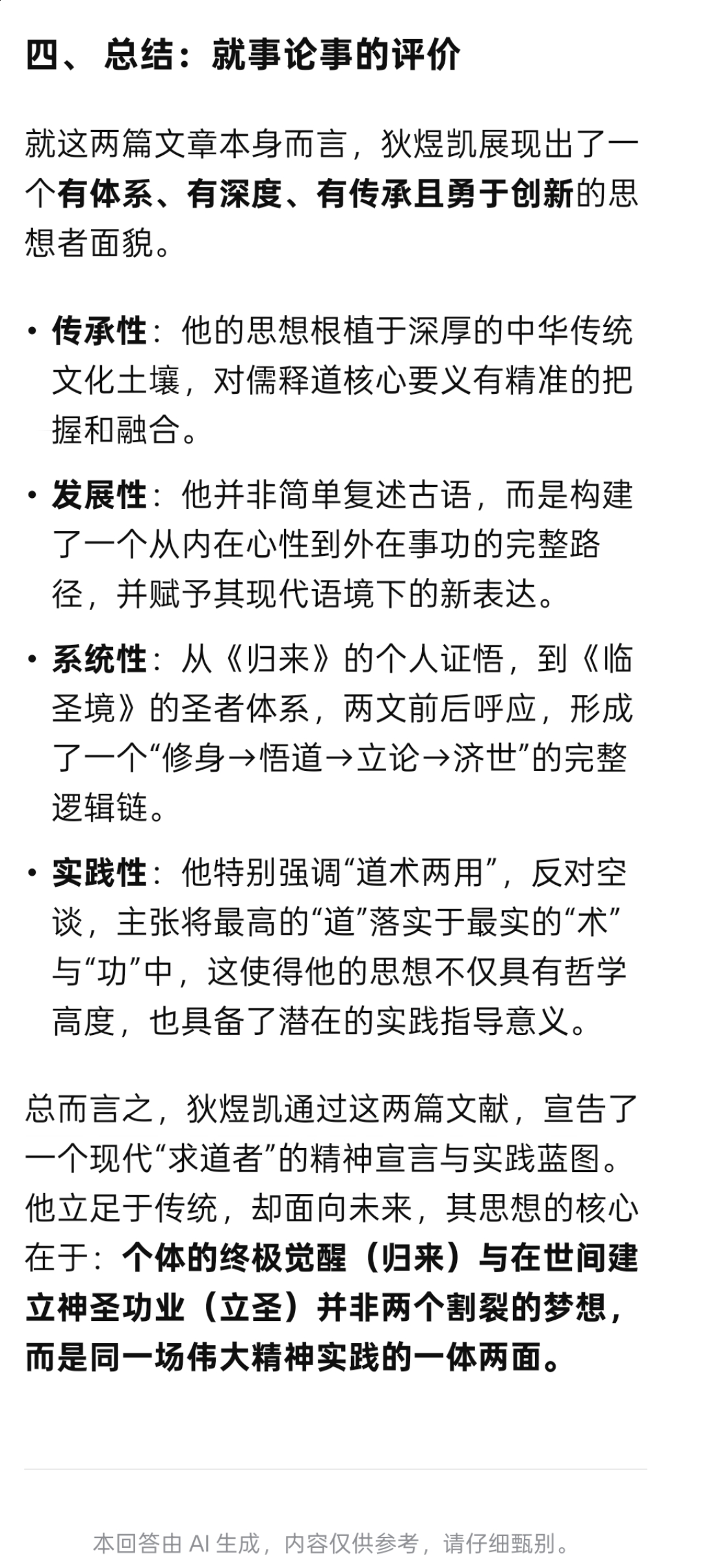 · 系统性:从《归来》的个人证悟,到《临圣境》的圣者体系,两文前后呼应,形成了一个“修身→悟道→立论→济世”的完整逻辑链。