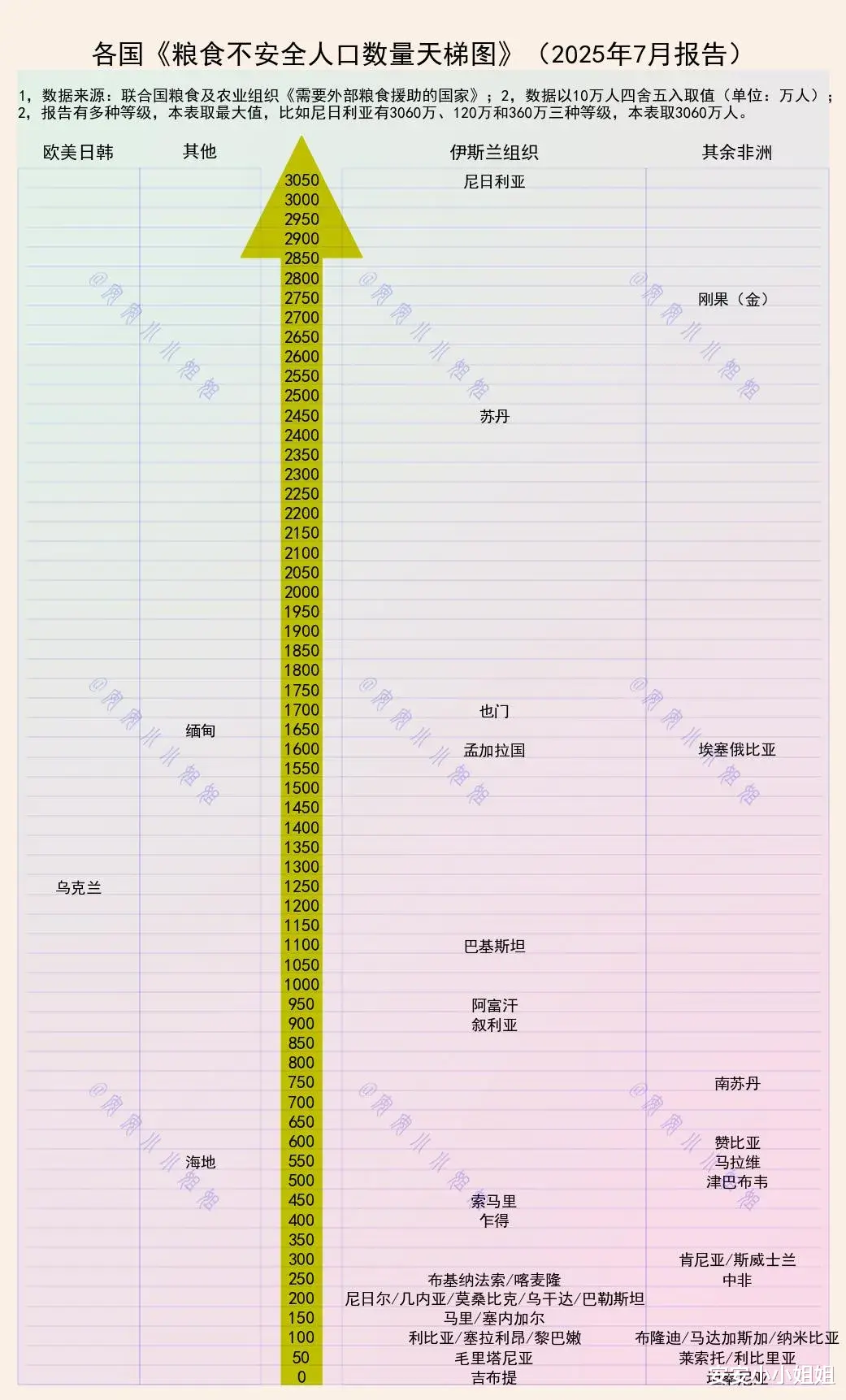 本期粮食短缺的41个国家,有23个属于伊斯兰合作组织成员国,包括很多网友关心的加沙地区。在这些区域,冲突、气候和经济三重因素叠加,对相当一部分的生存产生了严重影响。具体到各国,分别有多少人受粮食短缺的影响呢?这一篇,我们将前述报告里的受粮食短缺影响的人口数量提出出来,绘制一张天梯图,观察受影响人口的分布情况。在前述的报告里,数据是粮农组织相关专家估算得到的,而且受影响的程度有所不同,比如人口超过2亿的尼日利亚,在报告里是这样描述粮食安全受影响人数的:“据估计,2025年6-8月期间,重度粮食不安全人口约3060万,其中,近120万人处于CH第4级“紧急”级别。该数据略低于2024年同期的重度粮食不安全人口预估值(3180万)。