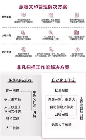 大型企业传统流程僵化,内容管理低效等问题正拉跨中大型企业的运营效率,柯尼卡美能达拥有从文印管控、企业内容管理、工作流程优化等多维度定制化解决方案。其中王牌派睿文印管理解决方案和非凡扫描工作流能大大降低中大型企业文印管控和纸质文件电子化管理需求,实现真正意义上的降本增效。