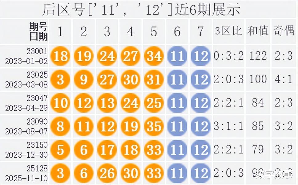 大乐透25128期开奖结果及中奖情况:出奖时间: 2025-11-10 星期一 前区号:3-6-26-30-33后区号:11-12大乐透前区隔期下落:30前区奇偶比:2:3 前区和值:98前区跨度:30 三区比:2:0:3没有连号