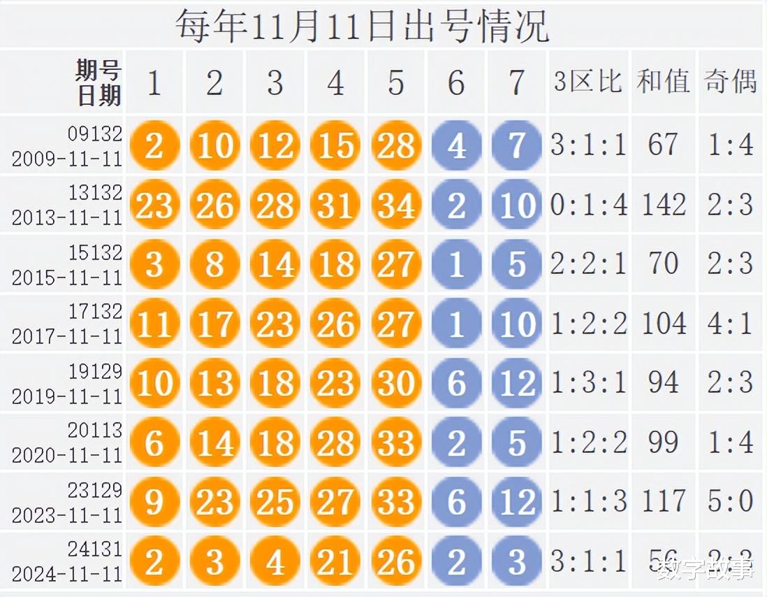 【其他历史数据查询统计】大乐透历史上的今天2025-11-11 星期二 大乐透不开奖每年11月11日出号情况: