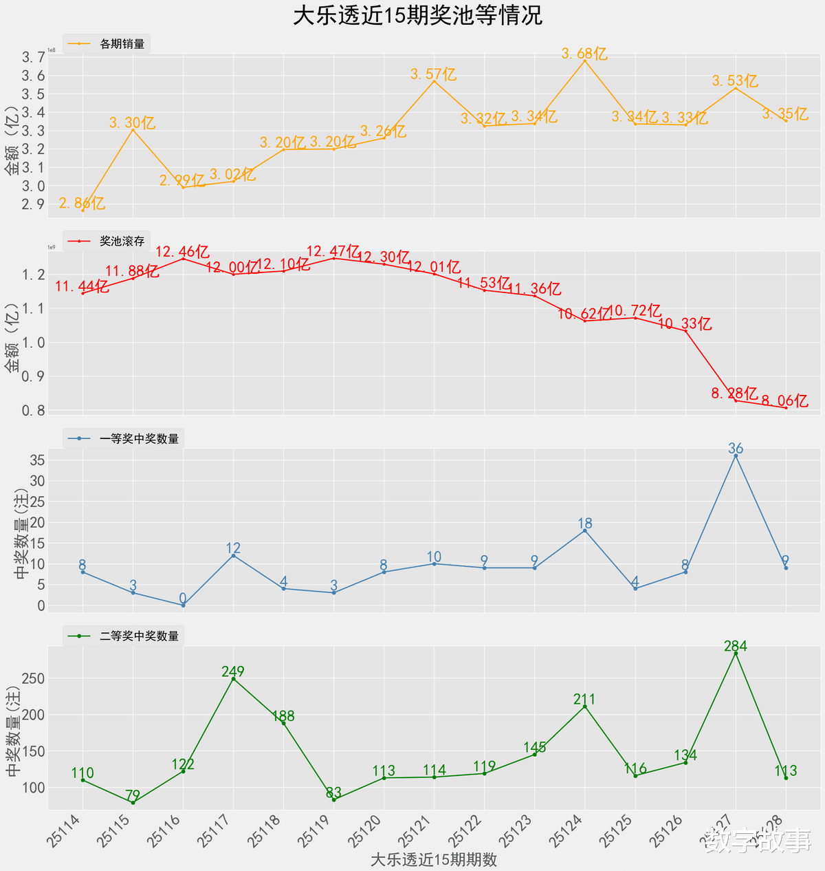 大乐透25128期一等奖:9注,追加: 0注二等奖:113注,追加: 27注。本期全国销售金额:3.352 亿 奖池滚存:8.061 亿.近15期奖池滚存, 中奖情况等信息: