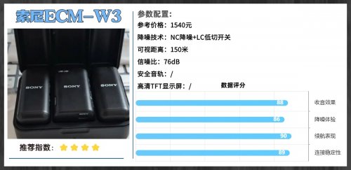 索尼ECM-W3发射器重17g,磨砂机身搭配可旋转背夹,夹衣领时近乎无感,久戴也不会拉扯衣物变形,防尘防滴设计适配户外多变环境。一拖二设计支持双人分轨收音,搭配高信噪比咪头,48kHz/24Bit数字传输让室内访谈人声清晰无底噪,安全音轨功能还能同步录制低20dB备份,避免高声爆音。单档降噪无法适配复杂场景,闹市中车流声抑制不足,户外4级风时防风罩压制力有限,气流声易混入;发射器开关阻尼偏轻,婚礼等场景易被误触关闭,徒增拍摄风险;全指向特性在多人场景易收录杂声,主声源辨识度下降。