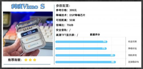 科唛Vimo S采用磁吸一体化设计,接收器与充电盒融合,开盖即自动配对开机,新手无需复杂调试。发射器仅拇指大小,重约20g,搭配金属背夹夹衣领稳固,贴内衬隐藏也无坠感。但短板明显:背夹夹持力偏紧,夹薄针织衫易勾丝;接收器无冷靴接口,相机拍摄需额外固定,且直连手机时自重导致单手握持易累。充电盒磁吸力度不足,装口袋晃动时易自动弹开,需小心配件掉落。