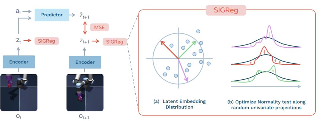 LeWM 最核心的突破,在于用两个简单且有科学支撑的训练目标,从根本上解决了传统 JEPA 的“表示崩溃”问题,彻底摒弃了经验性技巧。其一为预测损失,是让 AI 精准预测未来的核心特征,保证学的规律有用;其二是 SIGReg 正则化,逼着 AI 把核心特征分布得均匀多样,不让它把所有画面都映射成一样的特征。