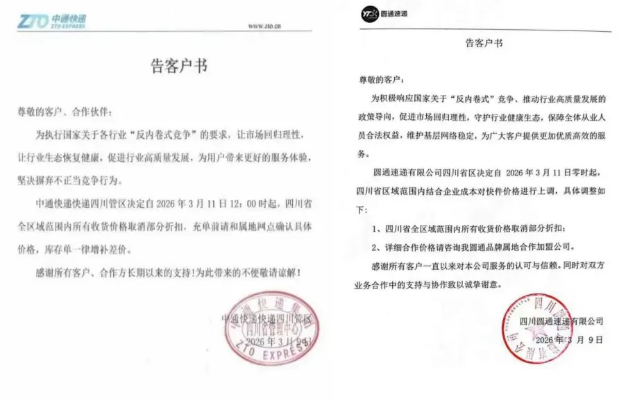 3月13号的事,群里已经传遍了。四川那边也跟进了,中通圆通韵达申通极兔五家全涨。广东那边“冷静期”延到5月底。